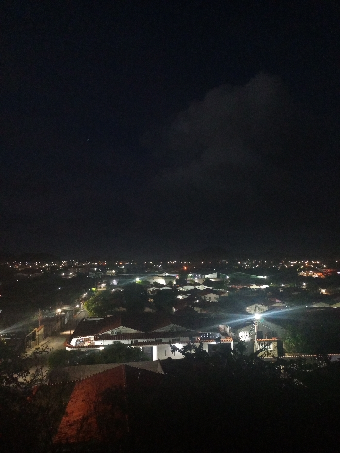 Night engulfs a sprawling cityscape. Dim streetlights snake through residential areas with tiled roofs, punctuated by brighter building lights. A dark cloud hovers high above, while a single, distant star twinkles in the inky sky. The foreground is shadowed by foliage, obscuring details and adding to the overall sense of nocturnal mystery.