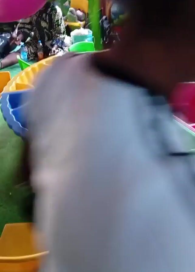 brightly colored, segmented, triangular plastic table standing on a green, artificial turf floor. The table has a central pink section and is surrounded by variously colored sections, including blue, green, yellow, and red. A person is holding balloons nearby. Several small, yellow plastic chairs are scattered around the table. A colorful mural of animals decorates the wall in the background. There is background noise of music.