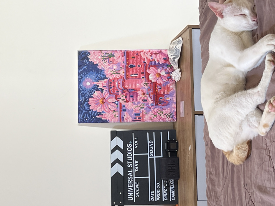 A white cat sleeps on a brown bed next to a wooden nightstand. On top of the nightstand are a diamond painting of a pink flower garden, a movie clapboard, a watch, and a JBL speaker. The wall behind the nightstand is white. The clapboard is black with white lettering and has the words "UNIVERSAL STUDIOS" on it.