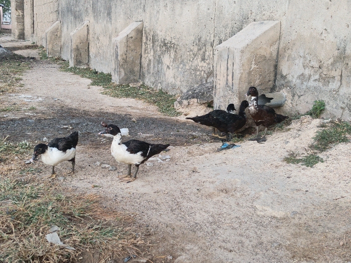 A group of Muscovy ducks congregate near a weathered concrete structure