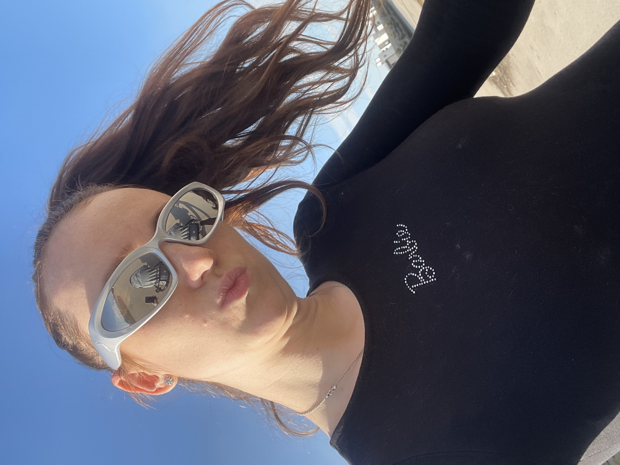 A low-angle, close-up shot depicts a woman with long, brown hair wearing reflective sunglasses and a black top with a silver, beaded "Barbie" logo. She is looking down with her lips slightly pursed. The sunglasses reflect an urban environment, possibly the city of Подстёпки, Russia, though specific landmarks are not visible. She is wearing a silver necklace. The background shows a clear, blue sky. Part of a concrete structure is seen along the right edge of the frame.