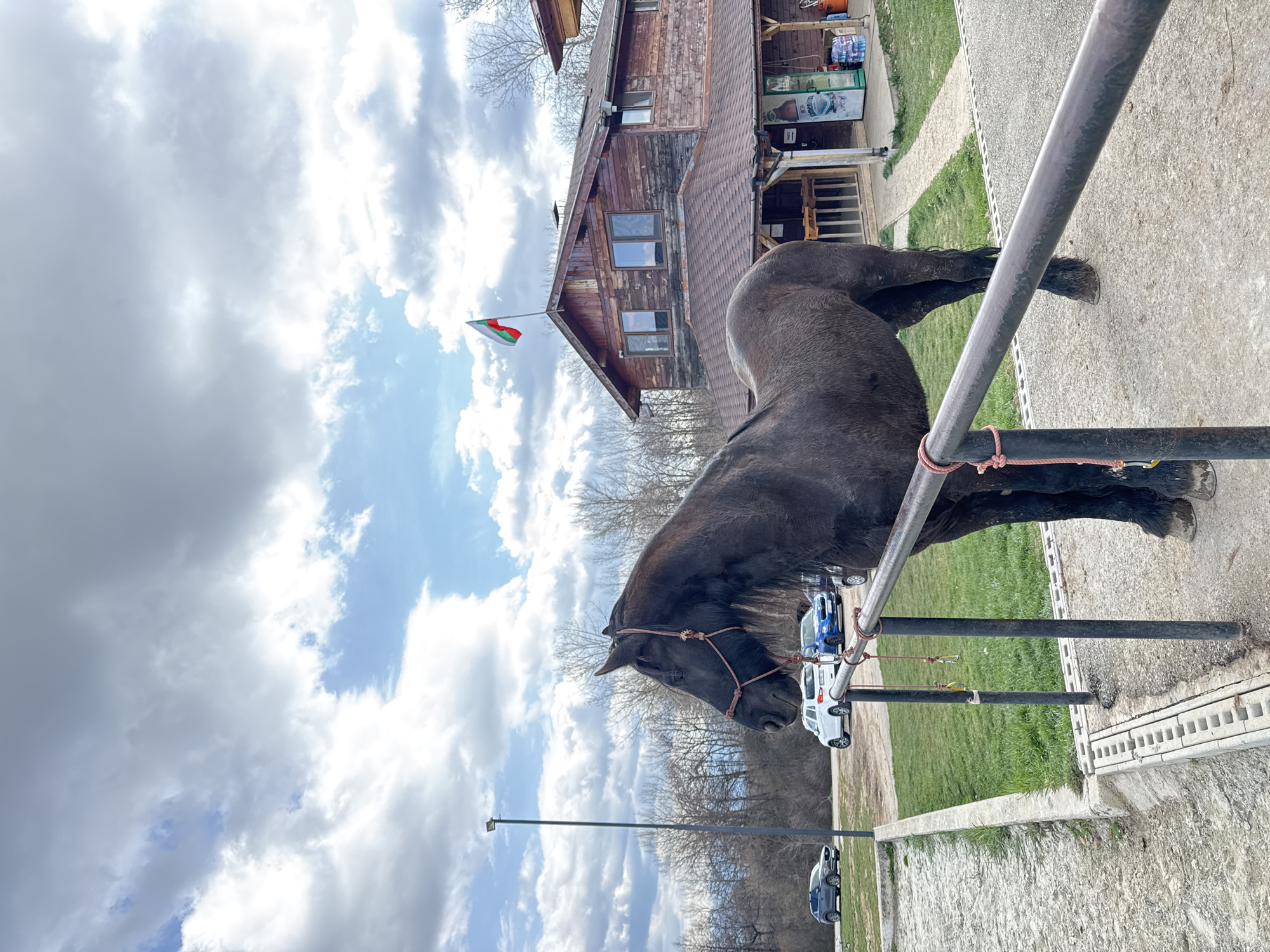 A horse is tethered to a metal post in Kovachevtsi, Bulgaria. The horse is dark in color. In the background is a rustic building with a flag. Multiple cars are parked nearby. The sky is cloudy.
