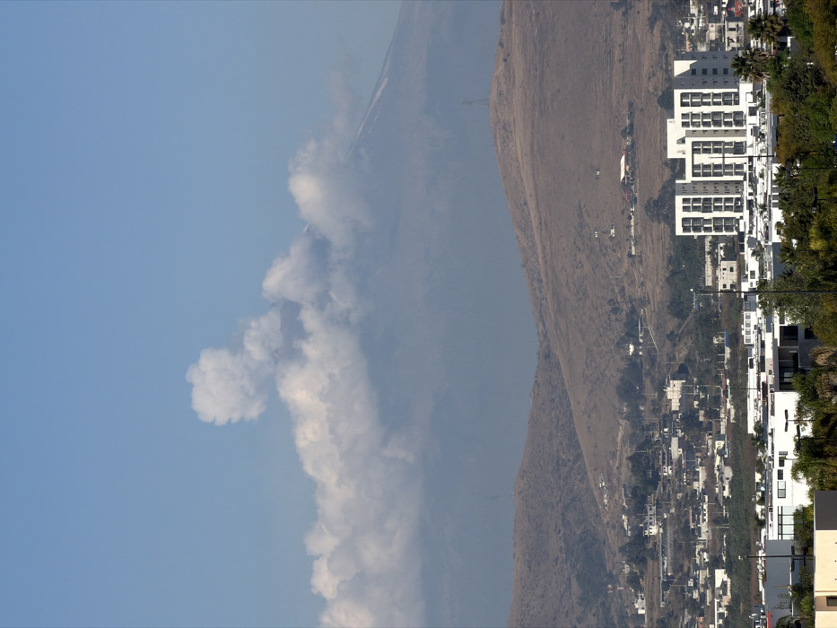 An elevated long shot captures a panoramic view of Santa Clara Ocoyucan, Mexico, under a clear blue sky with partial cloud cover. The scene depicts an urbanized landscape transitioning into arid hills and a distant stratovolcano. In the foreground and midground, numerous residential and commercial buildings with flat roofs are visible. Dominating the right-center is a modern, multi-story white building featuring prominent vertical window sections. Interspersed among the structures are green trees and shrubs, including palm-like vegetation. Behind the developed area, a series of dry, brown, undulating hills rise, exhibiting sparse vegetation and supporting visible power transmission towers. In the distant background, a large, snow-capped stratovolcano, partially obscured by a band of white cumulus clouds, is prominent. A distinct plume of white-gray smoke or ash emanates from the volcano's crater, rising vertically above the surrounding clouds. No individuals or specific human activities are discernibly depicted. The overall environment suggests a dry climate with volcanic activity.