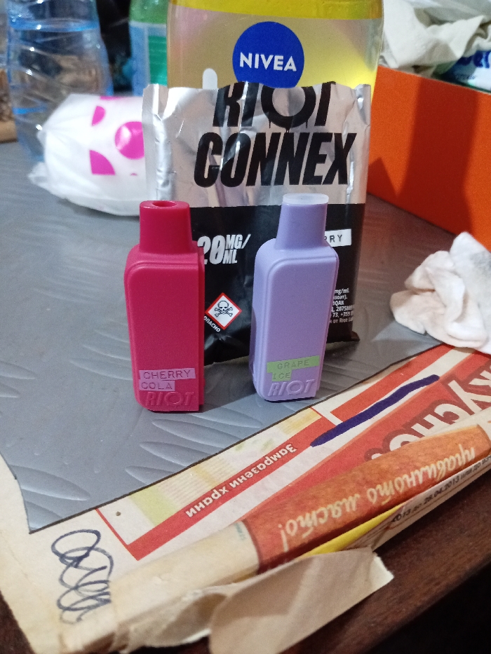 This image captures a close-up, angled view of various objects resting on a grey, textured surface in an indoor setting located in Войводино, Bulgaria. In the foreground, a piece of printed paper or thin cardboard is diagonally positioned, featuring Cyrillic text including "Замръзени храни" (Frozen foods) and "маслино масло!" (olive oil!), alongside the date "28.04.2013". Overlapping this paper is a small, light brown, folded paper wrapper. To the right, a crumpled, light-colored fabric or paper tissue is visible. Centrally, two small, rectangular, bottle-shaped devices are arranged upright. The left device is pink, marked "CHERRY COLA" and "RIOT". The right device is lavender, marked "GRAPE ICE" and "RIOT". Both possess flat tops with small openings. Behind these devices, a silver foil pouch, partially opened, displays "RIOT CONNEX", "20 MG/ML", and a black skull and crossbones hazard symbol. Directly behind the pouch, a yellow container with a blue "NIVEA" logo is visible. The background, out of focus, includes a clear plastic water bottle, a white round container with pink polka dots, a green bottle, and an orange object. No individuals are present in the scene.