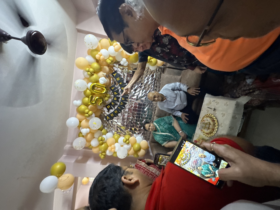 This image depicts an indoor celebratory scene within a residence in Bidhannagar, India