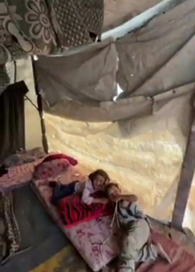 Inside a tent-like structure, two young children are lying on bedding. The interior of the structure appears worn and makeshift, with patched fabric covering the walls and ceiling. A young boy with curly hair enters the frame. He is wearing a white shirt. He is smiling and looking at the camera. Another small boy is wearing a red and blue shirt. He walks past. The interior is cramped.