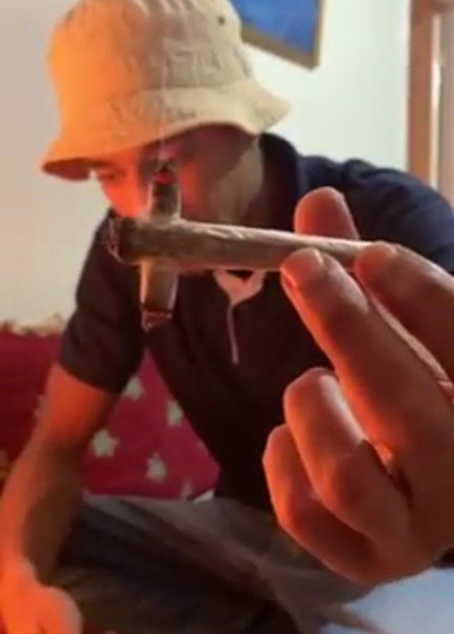A young man sits on a red floral-patterned sofa, wearing a navy blue short-sleeved shirt, light wash jeans, and a light-colored bucket hat. He holds up a lit cross-shaped joint, then puts it to his lips and inhales, blowing out a large plume of smoke. He is wearing a beaded bracelet on his right wrist. A lighter is visible in his left hand. A framed painting hangs on the wall behind him. The scene is lit with an orange glow.