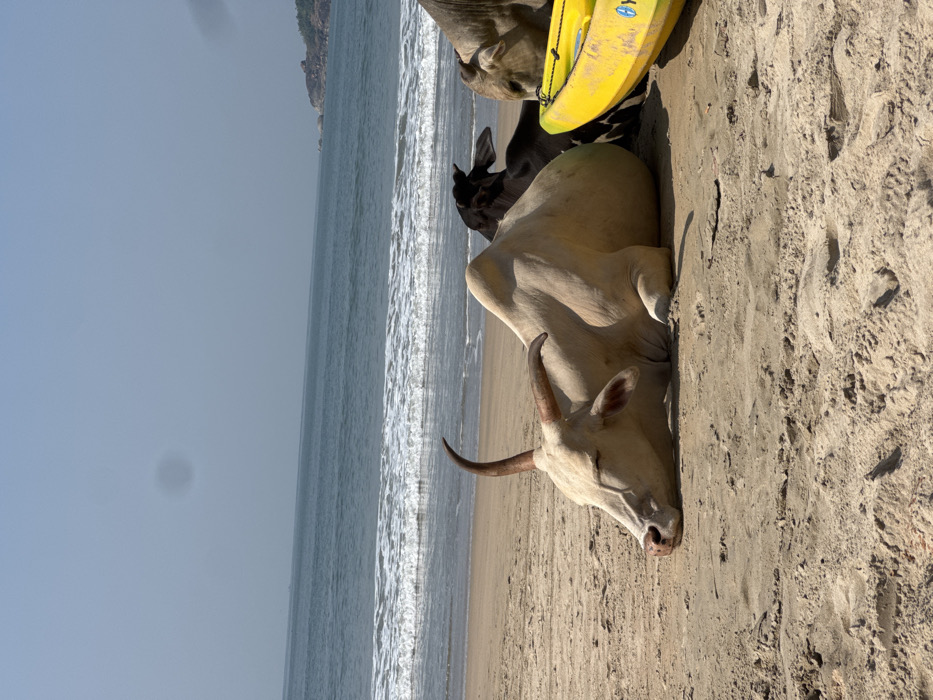 - "A tanned cow rests on a sandy beach next to the ocean, where waves are crashing on the shore" by FM-OzlZ32, licensed under CC BY 4.0