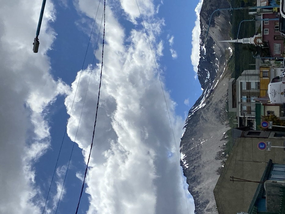 A landscape featuring a mountain range on the right, its peak covered in snow, juxtaposed with a cloudy sky on the left. Power lines stretch across the image. At the base of the mountain, buildings and a bus are visible, indicating a settlement. The perspective is tilted, giving the image an unusual orientation. A street sign with a blue "E" is visible in the lower right.