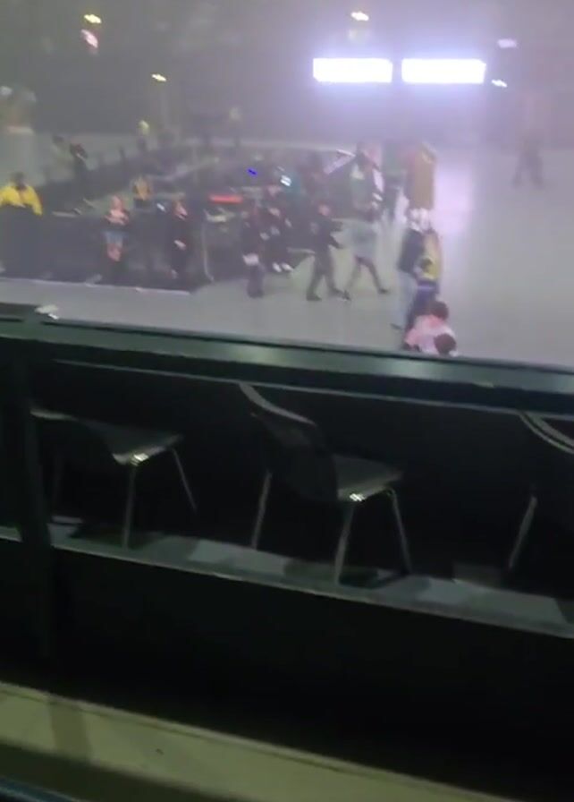crowded indoor event with heavy fog or smoke. People are walking around on a large floor, possibly leaving or arriving. The view is from a higher level behind a barrier and some seating. There are bright lights illuminating the scene. The fog obscures the details of the people and the environment.