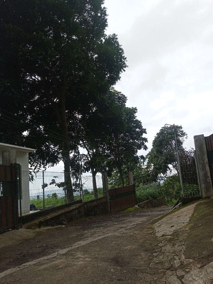 The scene depicts a downward-sloping, dark gray paved road in Hasanparthy mandal, India, under an overcast sky. The road surface exhibits cracks and lighter streaks. On the left, a partial white building structure with an open, dark brown metal gate (featuring vertical bars) is visible. Behind this gate, a light-colored metal mesh fence extends horizontally across the mid-ground. Parallel to the road and below the fence, a moss-covered concrete retaining wall is present. Several tall, dark green leafy trees stand prominently on the left and extend into the background, partially obscuring the distant landscape. Utility lines are strung horizontally in the upper left quadrant, passing near the trees. On the right, a dark brown metal gate, similar in appearance to the left one, is partially visible and appears open or ajar, supported by a grey concrete pillar. Another moss-covered retaining wall runs along the right edge of the road, sloping downwards. No individuals or active subjects are present. The environment is heavily vegetated beyond the immediate road and structures.