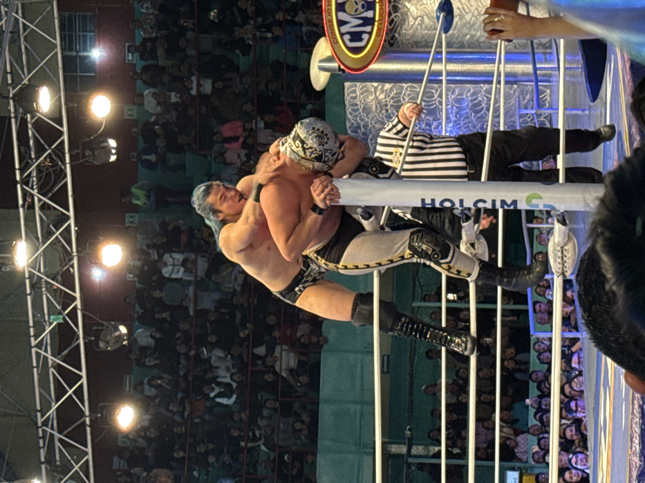 A wrestling match inside a ring shows two wrestlers in a grapple