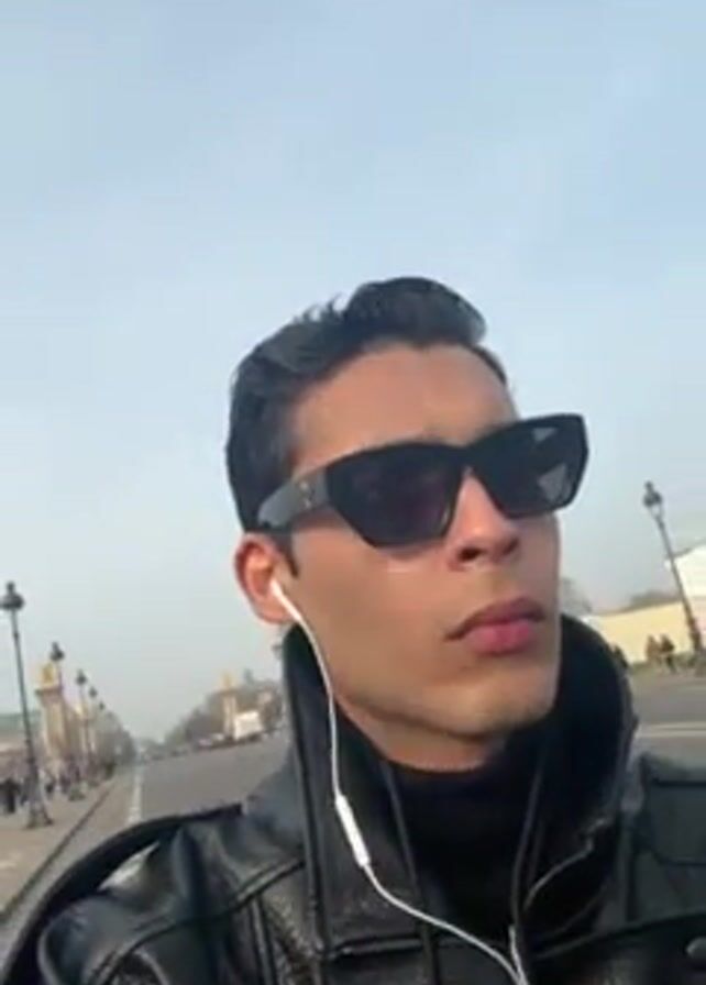 man wearing black sunglasses, a black turtleneck, a black leather jacket, and white earphones while seemingly moving down a crosswalk in Paris. The Pont Alexandre III bridge is visible in the distance, along with people walking on the sidewalk and cars driving on the street. The sky is pale blue and overcast.