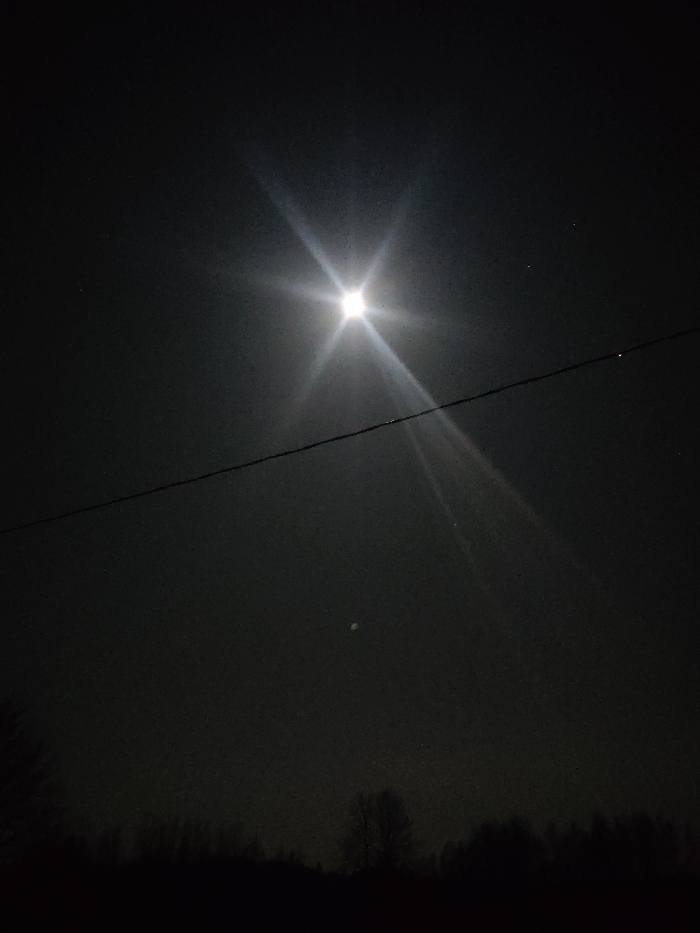 The image captures a nighttime outdoor scene in Jaunaglona, Latvia. A singular, intensely bright celestial object, consistent with the full or near-full moon, is positioned in the upper central sky, emitting a prominent starburst lens flare. A thin, dark utility line traverses horizontally across the mid-ground of the frame. Below this line, to the left of center, a small, faintly luminous, circular object is discernible against the dark sky. The lower quarter of the image is occupied by the silhouetted profile of a dense treeline or distant vegetation. The overall environment is dark, indicative of night, with minimal ambient light. No individuals, specific actions, or interactions are visible.