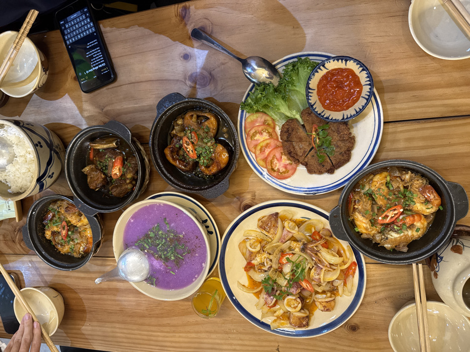 An overhead shot depicts a meticulously arranged meal on a light-colored wooden table, indicative of a restaurant setting in Thủ Đức, Vietnam