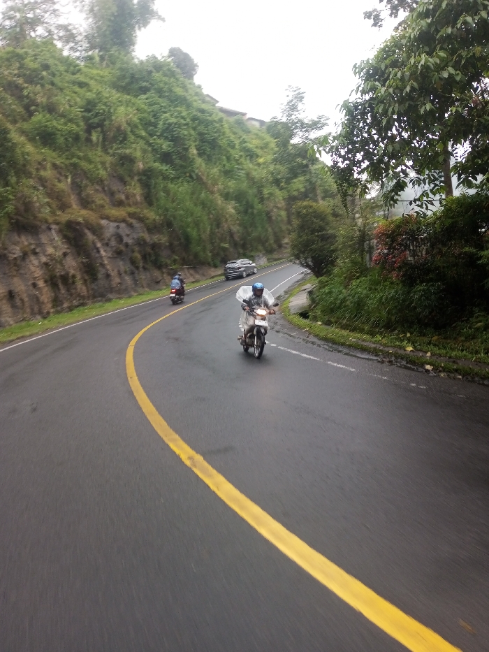 The image depicts a winding asphalt road in Dawathang_Dorjibi_ Kashingtsawa, Bhutan, under an overcast sky. The road, appearing damp or reflective, curves sharply to the right in the foreground, marked by a prominent solid yellow line. A steep, densely vegetated hillside with exposed rock faces borders the left side of the road. The right side is lined with trees and lush green and reddish-leafed shrubbery, with a visible drainage channel. Three vehicles are in motion on the road. In the mid-foreground, a person on a light-colored motorcycle, wearing a light-colored or transparent poncho, travels towards the viewer. Further along the curve, a second person on a darker motorcycle, wearing a blue garment and a backpack, is also traveling towards the viewer. In the background, a dark four-door sedan or SUV is visible on the upper section of the curved road, moving in the general direction away from the camera. Structures are partially visible amidst the dense foliage on the distant hillside.