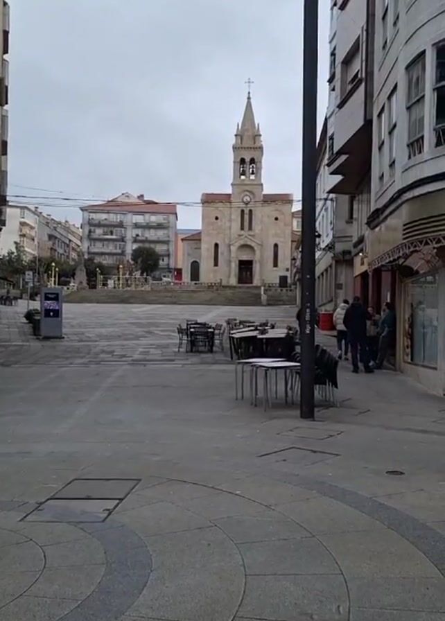 town square on an overcast day, with a church in the background. The church is made of light-colored stone and has a steeple with a cross on top. There's a clock on the front of the church tower. In the square, there are tables and chairs, likely for outdoor dining. A few people are standing near a building on the right side of the frame, appearing to be conversing. Some other people are walking across the square towards the church. The ground is paved with a mix of gray stone, and there are circular patterns in the paving near the camera. A tall, dark pole stands near the right side of the frame. At one point, a finger briefly obstructs the view.
