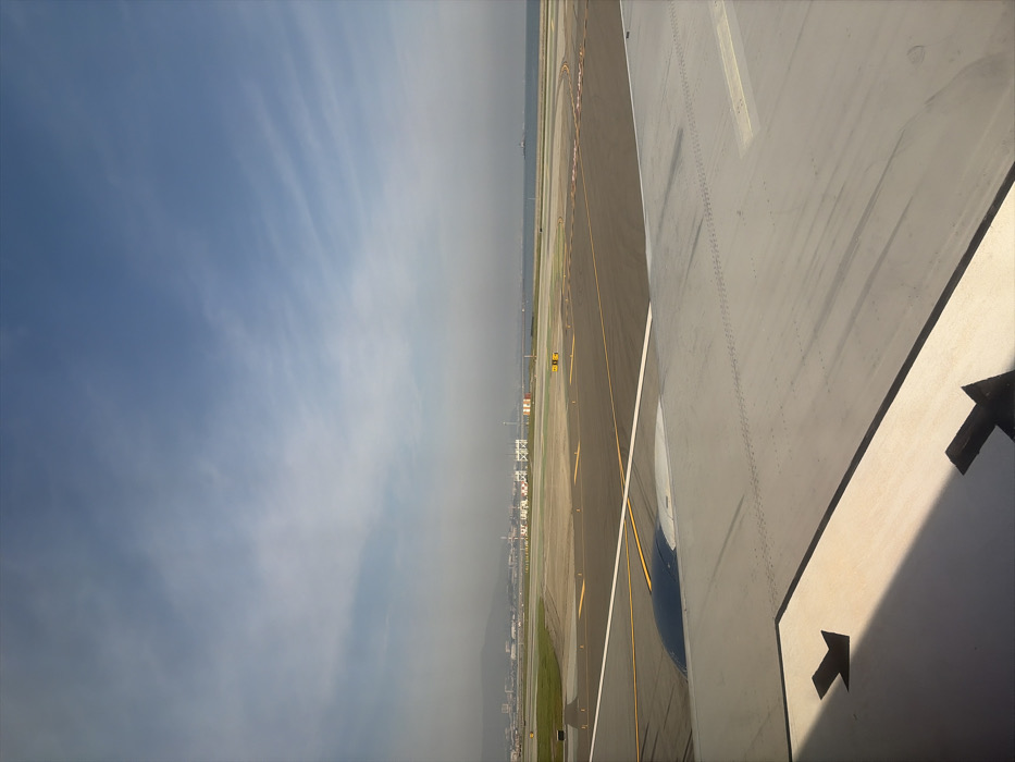 An airplane wing dominates the right side, featuring a black arrow pointing forward. The wing's surface is light gray, showing hints of rivets and markings. Adjacent to the wing, an airport runway stretches into the distance, lined with yellow and white markings. Buildings are visible along the runway's edge. The left side presents a blue sky with wispy clouds. The horizon is blurred, suggesting possible smog or haze. The scene is taken from within the plane, capturing the wing's perspective during takeoff or landing.