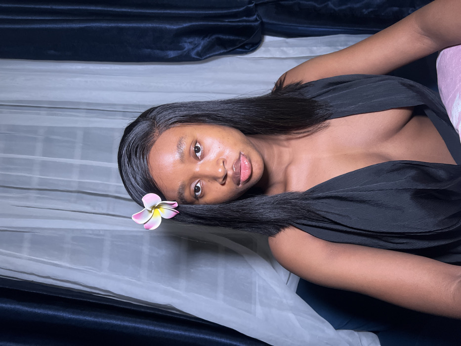 A woman lies on a surface with a dark blue and light gray cloth, posing at an angle towards the camera. She wears a black garment revealing some of her chest. A flower adorns her hair near her left ear. Her lips are glossy and slightly parted, drawing attention to her face. The composition is intimate and soft, with the draping fabric adding depth to the shot.