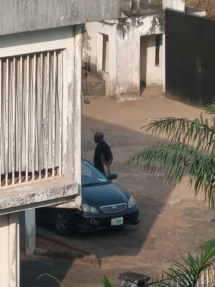 A black car is parked in front of a building with a man standing beside it. The man is wearing a black shirt and dark pants. There is a gate in the background. The car has a license plate. A palm tree is in the foreground on the right side of the image. Part of another building is visible on the left side of the frame. The location appears to be a residential area with sandy ground.
