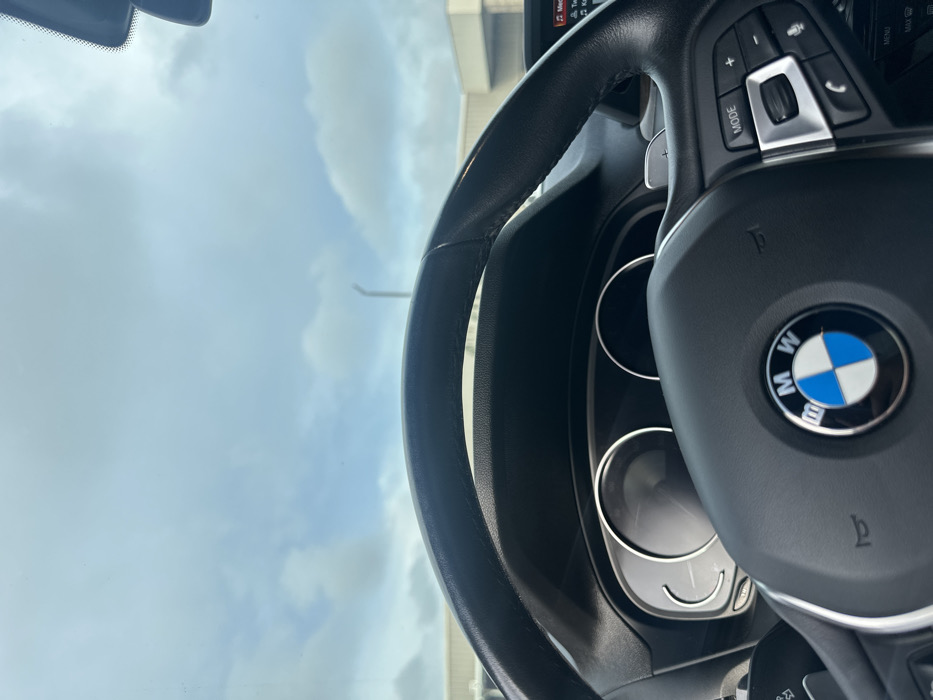A partial view from inside a BMW, capturing the steering wheel with the iconic logo prominently displayed. The dashboard and digital display are partially visible. Through the windshield, a cloudy sky is seen, suggesting an outdoor setting. The composition focuses on the car's interior elements, highlighting the luxury vehicle's design.