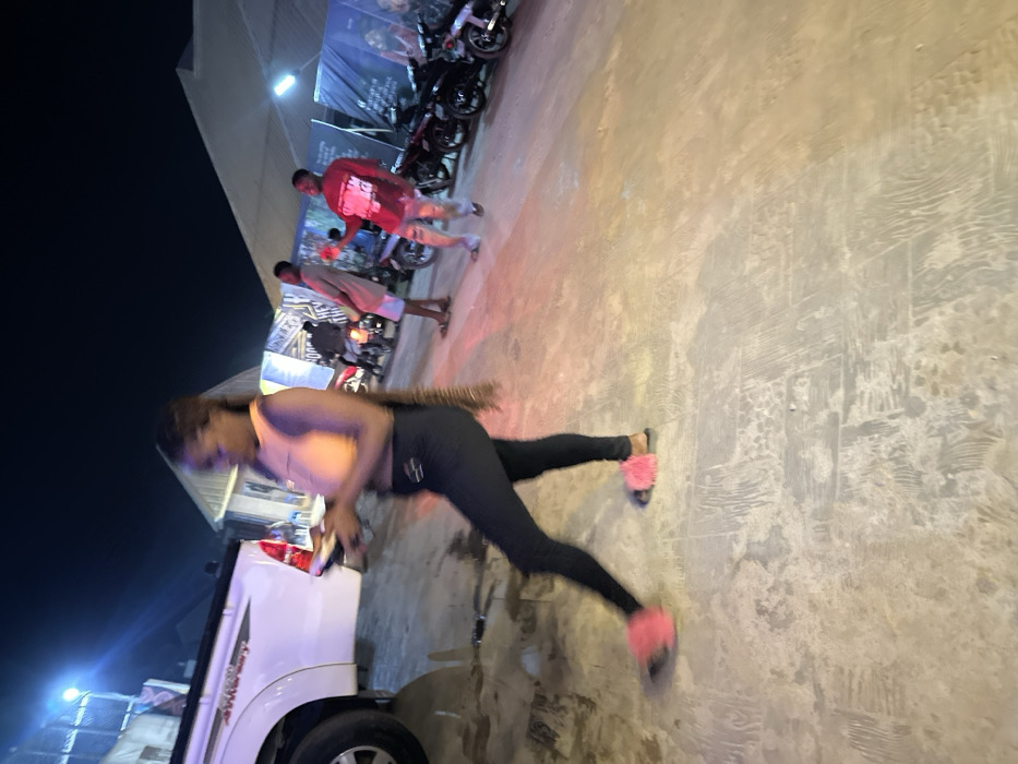 A woman in workout attire and pink slippers poses beside a white pickup truck. Two men stand near motorcycles in the background. The scene is outdoors, at night, with artificial lighting illuminating the space. The perspective is slightly tilted, with the woman in the foreground and the men and bikes further away.