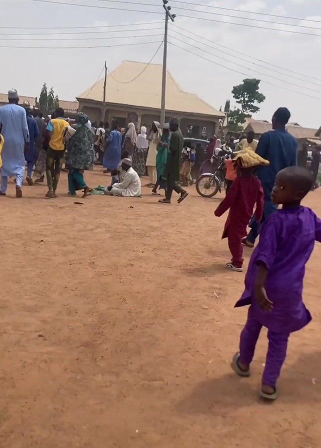 daytime outdoor scene of a gathering of people in what appears to be a village. The ground is dirt or sand. Many people are walking around, some holding hands with children. Most of the men are wearing traditional Islamic-style clothing, with various colors and patterns. Some are wearing hats. A few women are visible, some wearing hijabs. There are motorcycles parked along the side of the path. Buildings can be seen in the background, including a building with a corrugated metal roof. Power lines are visible overhead. The sky is overcast. The camera follows a man in a red robe holding the hand of a child in a purple outfit.