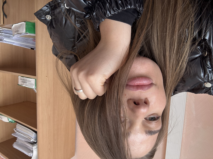 An indoor, close-up portrait depicts a female individual with long, light brown hair, partially obscuring the left side of her face. She is looking towards the camera with a neutral expression. Her left hand is raised, with fingers curled and resting against her temple/ear area; a silver-colored ring with a small, clear stone is visible on one finger. She wears a black, shiny, puffer-style jacket with prominent snap fasteners on the front. The background features a plain, light-colored wall on the left and a light-wood shelving unit on the right. The shelving unit contains multiple stacks of white papers and documents, along with several green and white cardboard boxes or binders. One visible box is labeled "АРИОН" in Cyrillic script. The environment suggests an office or a room with office storage. The precise location within the city of Chernushka, Russia, cannot be determined from the visual information provided in the image.