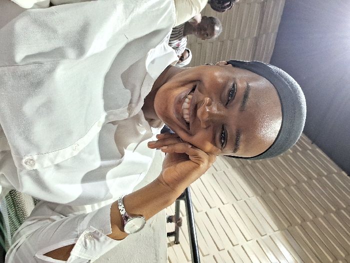 The image captures an adult female in the city of Egan, Nigeria, smiling broadly directly towards the camera