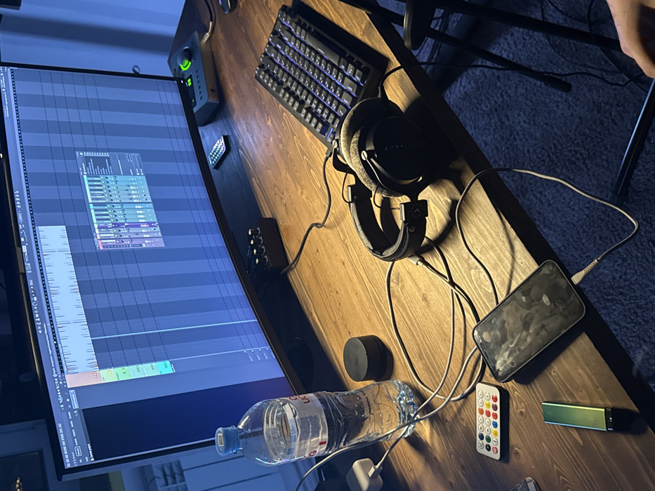 An indoor scene, likely a studio or office, is depicted in Rostov-on-Don, Russia, with cool blue ambient lighting. A large, curved ultrawide monitor dominates the background, displaying a Digital Audio Workstation (DAW) interface, specifically FL Studio, showing audio tracks, waveforms, and a mixer panel. On a light brown wooden desk surface, various electronic devices and personal items are arranged. From left to right: A clear plastic bottle of mineral water (labeled "Saint-Geran") stands to the left of the monitor. Beside it, a white USB power adapter is partially visible, with cables extending from it. A small, black cylindrical object rests near the water bottle. Centrally positioned in front of the monitor is a compact black audio interface or controller with four prominent knobs. To its right, a pair of over-ear headphones, identified as Sennheiser, with worn earcups, lies on the desk. Further to the right, a black mechanical keyboard with illuminated keys is present. On the far right, a silver-and-black audio interface, appearing to be an Audient EVO model with green illuminated indicators, is visible. In the foreground, a dark-colored smartphone with a smudged screen lies face up, connected via a white cable, presumably charging. Next to the smartphone, a slim, metallic green-to-black gradient device, resembling a disposable vape pen, is positioned. A small, multi-colored button remote control is located near the bottom left of the frame. Numerous cables, both black and white, crisscross the desk, connecting the various electronic components. A dark blue carpet or rug is visible on the floor beneath the desk, with a black chair or stool leg partially seen on the right side of the image. The setup suggests an active creative workspace, likely for music production.