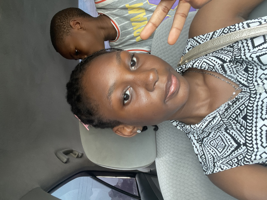The image displays two individuals inside a vehicle. In the foreground, a young female, approximately in her late teens to early twenties and of African descent, is positioned, looking directly at the camera. She has dark skin, braided hair adorned with a pink clip on the left side, a small silver stud earring in her left ear, and a thin silver chain necklace. Her attire consists of a sleeveless collared shirt with a black and white geometric pattern. Her left hand is visible, forming a "peace" sign with the index and middle fingers extended. Behind her, partially visible on the right side of the frame, is a young male child, also of African descent, with short dark hair. He wears a grey sleeveless tank top featuring a design with purple and yellow elements. The child is looking towards the left, away from the camera. The vehicle's interior features light-colored fabric seats and grey overhead trim. Through the car window on the left, a blurred outdoor scene with indistinct structures and overhead wires is visible under daylight conditions. The specific location within the city of Ajaokuta, Nigeria, cannot be determined from the visual information present in this image.