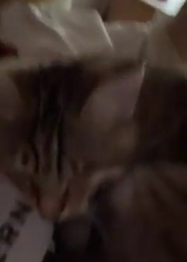 A close-up video shows a tabby cat sleeping on a white surface with the word "INTERNATIONAL" partially visible