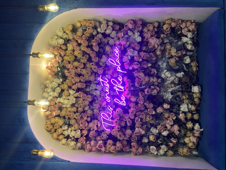 The image displays an interior decorative wall feature. A recessed, arched alcove is filled entirely with a dense arrangement of artificial roses in shades of pale pink, cream, and faded yellow. Centered within this floral display is a bright pink/purple neon sign illuminating the script text: "This must be the place." Above the neon sign, four vintage-style Edison filament bulbs hang from the top of the arch, emitting a warm, yellowish light. The wall surrounding the arch is a deep, textured blue, appearing to be upholstered or paneled. A padded bench or seating area, also in deep blue, is visible at the base of the alcove. The scene lacks any individuals, active subjects, or discernible interactions. The specific location within Dhaka, Bangladesh, is not identifiable from the visual information provided.