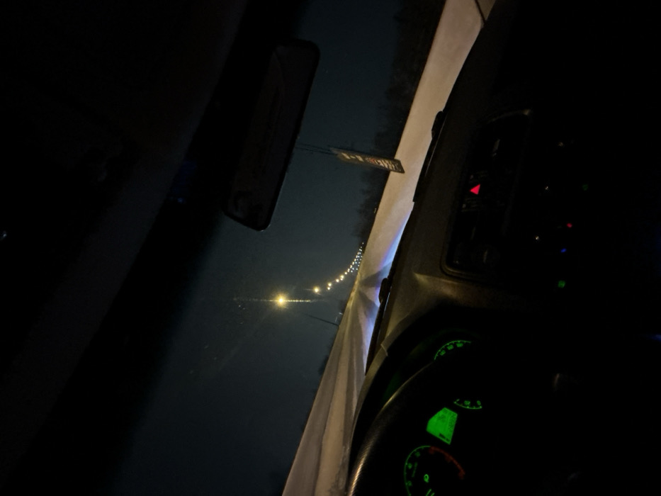 The view from inside a car at night features a dark dashboard with illuminated green and red lights
