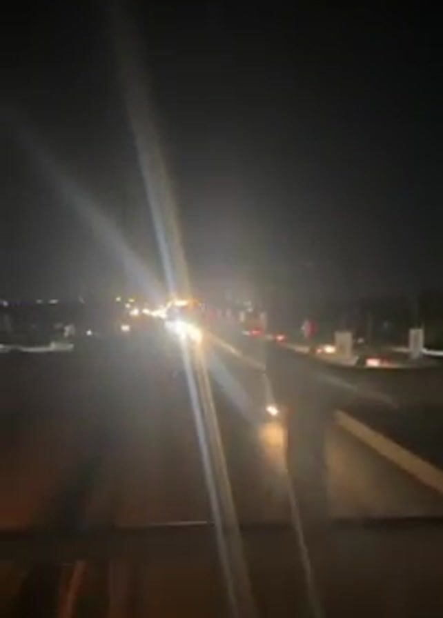 A blurry shot from an elevated position shows a highway at night. Car headlights are visible, creating bright streaks of light that dominate the scene. Some traffic appears to be stopped or moving slowly. The background is dark, suggesting a city or suburban area with limited lighting. The camera seems to be positioned behind some kind of barrier or railing.