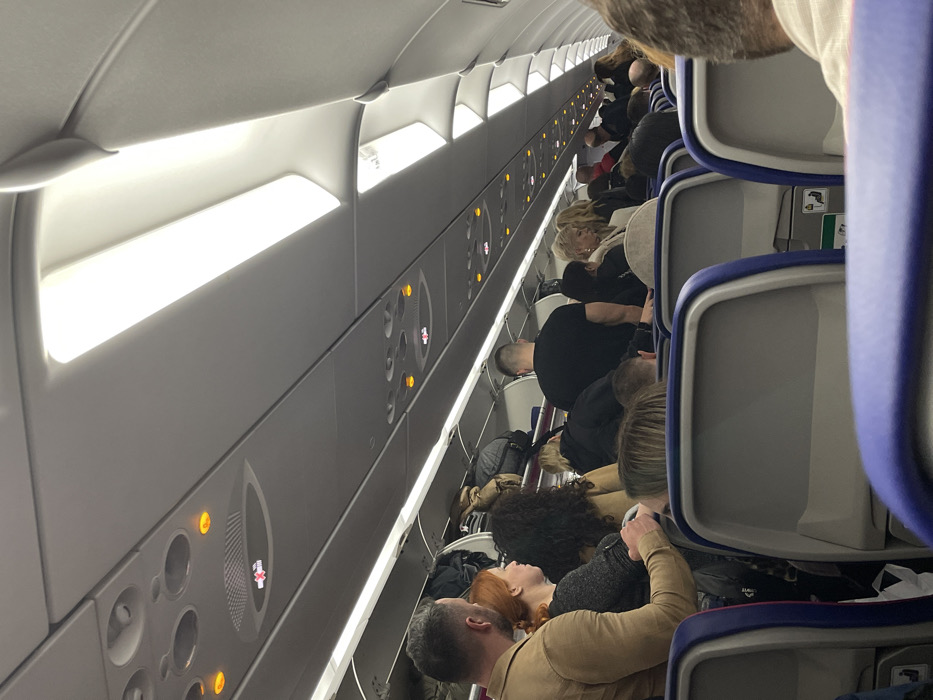 The image displays the interior of a commercial passenger aircraft cabin, observed from the perspective of a seated passenger