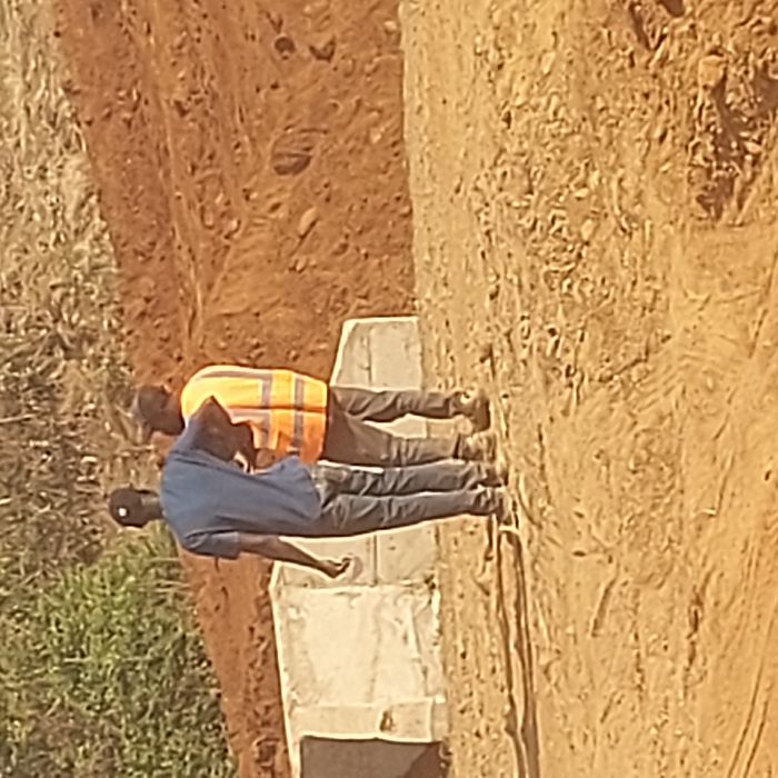 Two men stand next to newly constructed concrete structures. One man is wearing a blue shirt, jeans, and a black baseball cap. The other man is wearing a bright orange safety vest over a light shirt and jeans. The surrounding area features bare soil and construction debris, with vegetation visible on the left side of the image.