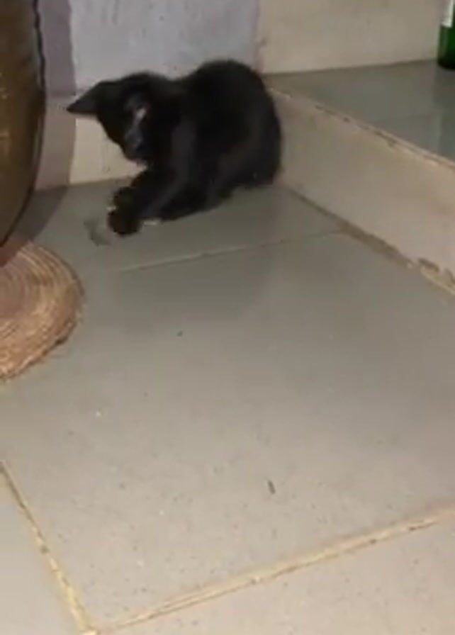 A black kitten is playing with a dead mouse on a tile floor in a corner. The kitten is batting the mouse around with its paws. There is a large brown pot next to the kitten and some stairs in the background. The floor is tiled and appears to be indoors.