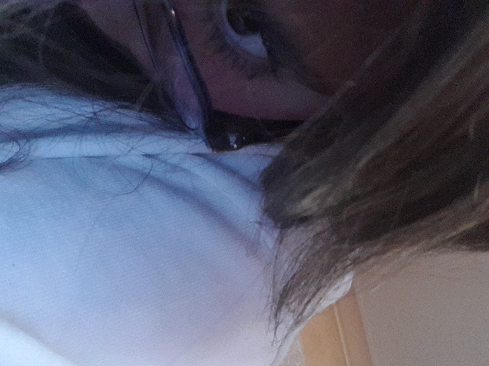 The image depicts a close-up, dimly lit, indoor scene. A single individual is partially visible, primarily showing the left side of their face. The left eye, featuring a light-colored iris and a dilated pupil, is clearly visible, along with eyelashes. A pair of dark-framed eyeglasses rests across the lower portion of the eye and the bridge of the nose. Long, multi-toned brown hair cascades around the face and extends towards the right side of the frame. A small, dark object, consistent with an earbud or a part of a headset, is partially discernible near the ear, obscured by hair. The individual is looking directly towards the camera. On the right side of the frame, a light-colored garment, appearing to be white or light blue fabric, covers the shoulder or upper torso area. The background is out of focus, revealing a light-colored surface, possibly a ceiling or wall, in the upper right quadrant. The scene is located in the city of Meknes, Morocco.