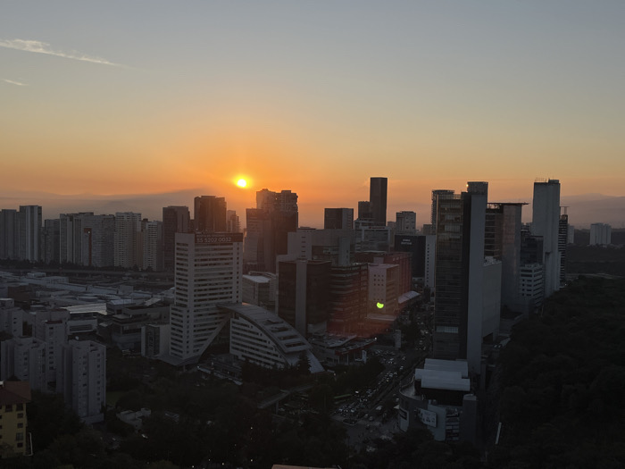 The image depicts an urban landscape at either sunrise or sunset, characterized by an orange-yellow sky with a prominent sun visible above the horizon, casting a warm glow. The scene is identified as Santa Fe, Mexico City, Mexico, based on the architectural style and phone number visible on a building. The foreground and mid-ground consist of a dense arrangement of modern high-rise buildings, predominantly commercial and residential structures, varying in height and design. One prominent, light-colored building in the mid-ground, slightly left of center, features an archway at its base and displays the phone number "55 5202 0032". To the far left, a cluster of residential towers is visible. To the right of the central buildings, a collection of darker, glass-fronted skyscrapers stands, partially silhouetted against the sun. Below the buildings, a network of roads is visible, carrying vehicle traffic which appears as blurred lights in some areas, suggesting movement. Significant areas of dark green foliage and trees are present, particularly on the far right, bordering the built-up area. The background shows hazy, distant mountains or hills under a gradient sky transitioning from orange near the horizon to light blue at the zenith. No discernible individuals are visible, only the infrastructure and implied presence of human activity through traffic.