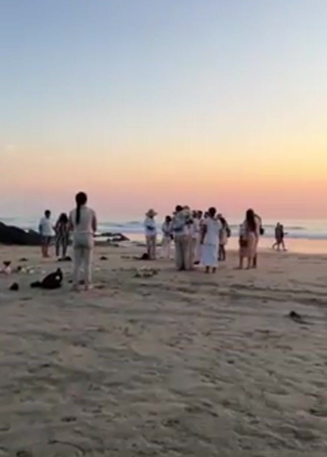 group of people gathered on a sandy beach at sunset. Most of the people are wearing white clothing. Some stand in a circle near what appears to be a small altar or ritualistic setup with a red flag nearby. Others stand closer to the ocean. The ocean is calm, with waves gently lapping at the shore, reflecting the orange and pink colors of the setting sun. Two women in white walk along the beach closer to the water. The scene seems peaceful and possibly spiritual in nature. A drumbeat rhythm can be heard throughout the video.