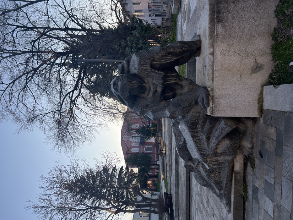 The image presents a static, wide-angle view of a public square in Kardzhali, Bulgaria, likely Vazrazhdane Square, with the House of Culture "Obedinenie 1896" visible in the background. The lighting suggests either early morning or late afternoon, under a clear, pale blue sky. In the immediate foreground, a large, dark-toned, abstract figurative sculpture is positioned on a light gray, rectangular stone plinth. The sculpture depicts a human-like form, possibly male, in a dynamic, upward-straining or reclining pose, with its head turned to the upper right quadrant of the frame. The surface of the sculpture exhibits a rough, weathered texture with distinct vertical dark streaks, consistent with water staining or material degradation. The figure's left arm appears bent, resting on the plinth, while the body extends backward across the plinth's surface. The ground surrounding the sculpture and extending through the square is covered with an orderly pattern of dark and light gray paver stones. Small, sparse patches of green grass and bare soil are visible around the base of the plinth and along the paved edges. The mid-ground features several dark brown wooden benches distributed across the paved square. Numerous deciduous trees with bare branches dominate the background and mid-ground, indicating a late autumn or winter season. Interspersed among these are several evergreen conifer trees. A tall, black pole, possibly a lamppost, stands upright behind the sculpture. In the distant background, a prominent two-story building with a reddish-pink facade, multiple white-framed windows, and a red-tiled roof is centrally located behind the trees. This building features a decorative central entrance with a small balcony. To the left of this building, a portion of a lighter-colored, possibly white or light yellow, building with green window frames is visible. To the right, another light-colored building with multiple windows can be seen. No individuals are present within the captured scene.