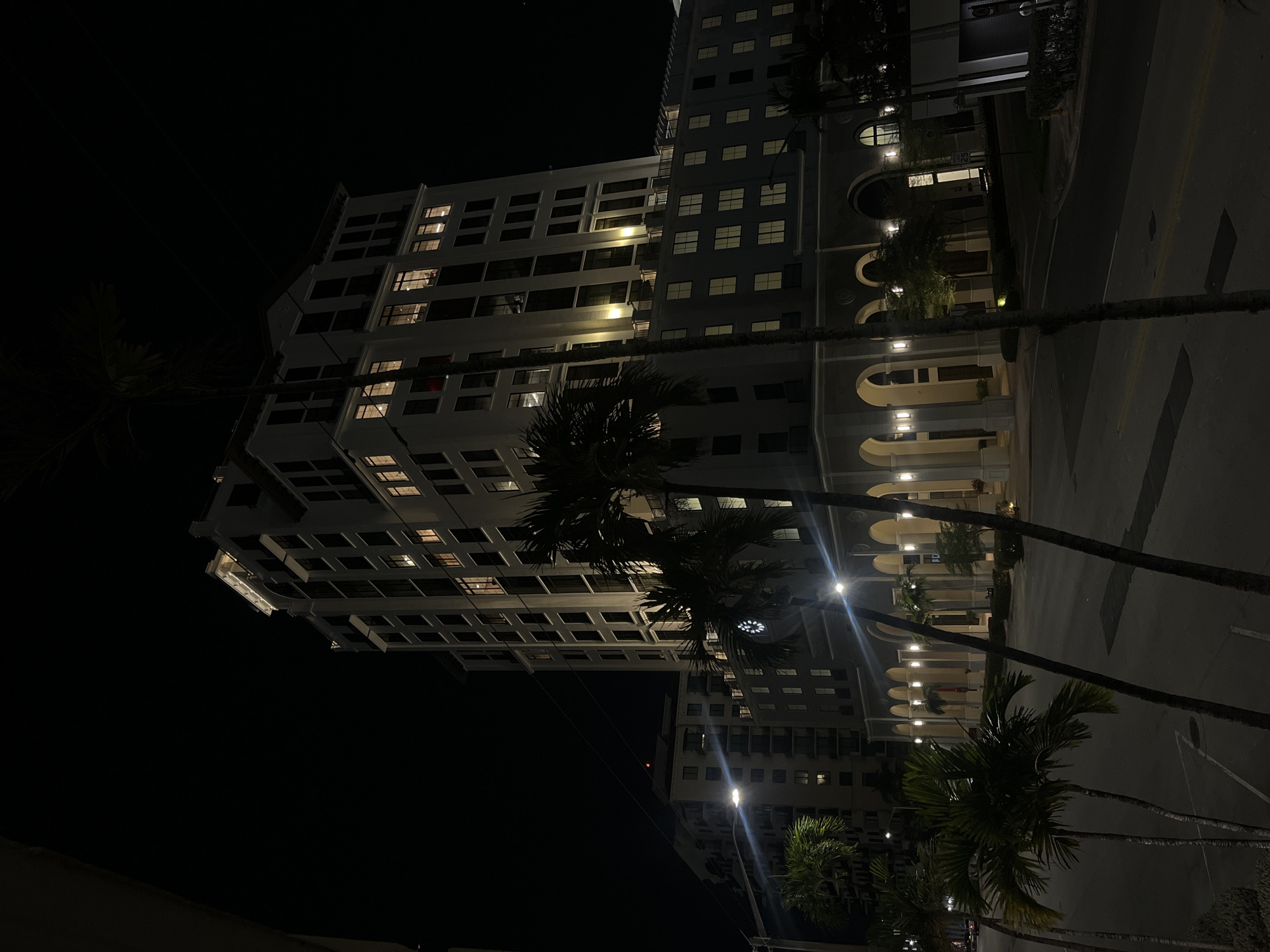 The image depicts an urban nighttime scene featuring a prominent, multi-story building of light-colored stone or stucco, approximately 12-15 stories tall, exhibiting classical or Mediterranean Revival architectural elements including arched ground-floor entrances and numerous rectangular windows. Many windows are illuminated with warm yellow light, and the building's facade is accented by exterior uplighting. A circular clock face is visible on the facade above the main entrance level. Numerous palm trees are interspersed throughout the foreground and midground, some partially obscuring the view of the building. To the left and slightly behind the primary building, a second, less ornate multi-story building with balconies is visible, also illuminated by interior lights, and a red light is present on its rooftop. The scene includes a paved street or roadway in the foreground with visible lane markings (double yellow line, white dashed line) and parking space outlines. A street sign indicating a "25" speed limit is visible on the right side of the street. Multiple streetlights cast bright, star-like flares across the image, illuminating the street and lower building facades. No individuals or vehicles are clearly discernible in the immediate foreground, though distant vehicle lights are visible on the far left. The sky is dark and clear. The perspective is slightly elevated, suggesting the photograph was taken from an upper floor or balcony. The location is Unknown, Unknown.