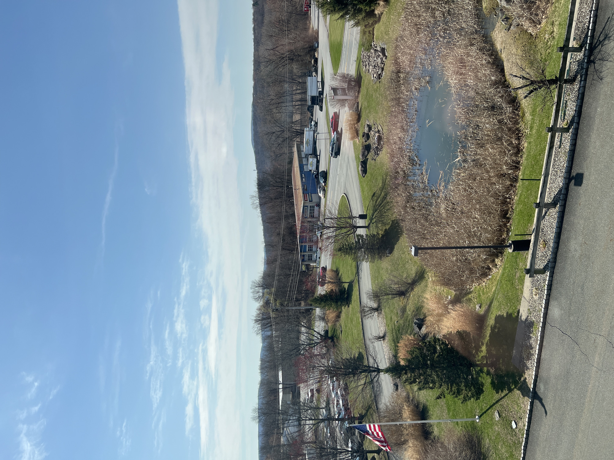 vertical view of a landscape in the Town of New Windsor, United States of America. A road runs along the right side, bordered by a wooden fence. A pond is visible next to the road, surrounded by dry vegetation and some green grass. A row of buildings is visible in the midground on the left, with several vehicles parked along the road. The American flag is visible in the foreground. The sky is blue with some white clouds.