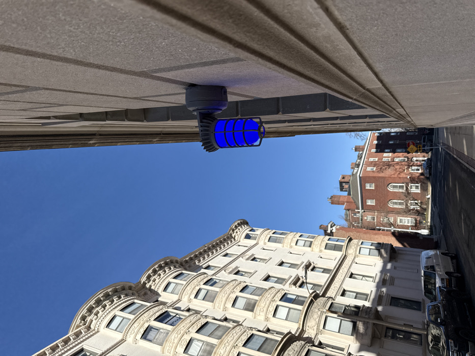 The image displays a daytime street view in Boston, Massachusetts, United States of America. On the right, a gray, industrial-style wall-mounted light fixture with a blue LED bulb enclosed by a protective cage is affixed to a stone-clad building facade featuring horizontal courses. To the left, a multi-story residential building, light-colored and ornately detailed with multiple curved bay windows, follows the curvature of the street. In the midground, a paved street runs into the distance, with a dark-colored pickup truck and a white cargo van parked curbside on the left. Further along the street on the right, a multi-story red brick building with arched windows and chimneys is visible, alongside a red stop sign and a partially obscured yellow directional sign. The sky is clear and blue. Long shadows are cast across the street and structures, indicating direct sunlight from a low angle. No individuals are present in the scene.