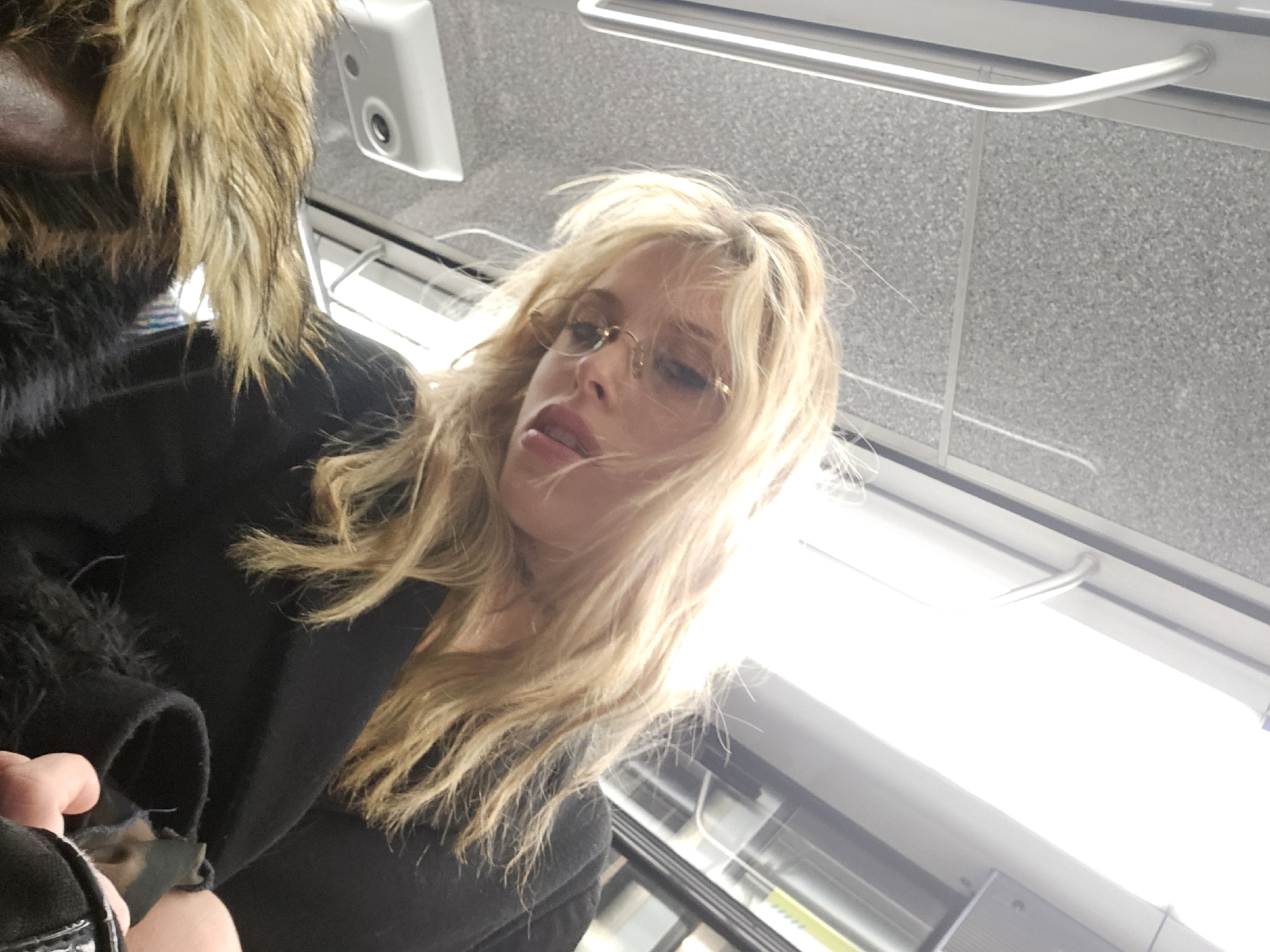 A low-angle shot shows two people inside a moving public transit vehicle, possibly a bus or a train. The vehicle's ceiling is visible, including overhead lights and ventilation fixtures. The person in the foreground is partially visible, with long, blonde hair, glasses, and wearing a dark coat with fur trim around the collar. The second person is partially visible on the left, wearing a similar dark coat with furry shoulders. The image is taken at an upward angle, suggesting the photographer is seated below the subjects. The location is presumed to be Paris, France.