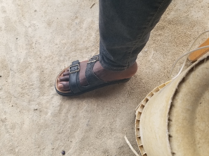 In Moba, Nigeria, an elevated view depicts the lower portion of a human right leg and foot on light-colored sandy terrain. The leg is clad in dark-toned trousers, possibly denim, with visible stitching. The right foot, exhibiting dark skin, wears a dark-colored sandal featuring two horizontal straps, each secured with a light-colored metal buckle. The sandal's sole is dark, and the footbed appears lighter. The toes are visible at the front of the sandal. In the lower-left, a section of an off-white or cream-colored plastic bucket is present, showing its upper rim with squared indentations. A thin white cord or string is draped over this bucket's edge. A short, light brown wooden object is partially visible on the ground adjacent to the bucket. The sandy ground exhibits slight textural variations and contains sparse, minute dark particles.