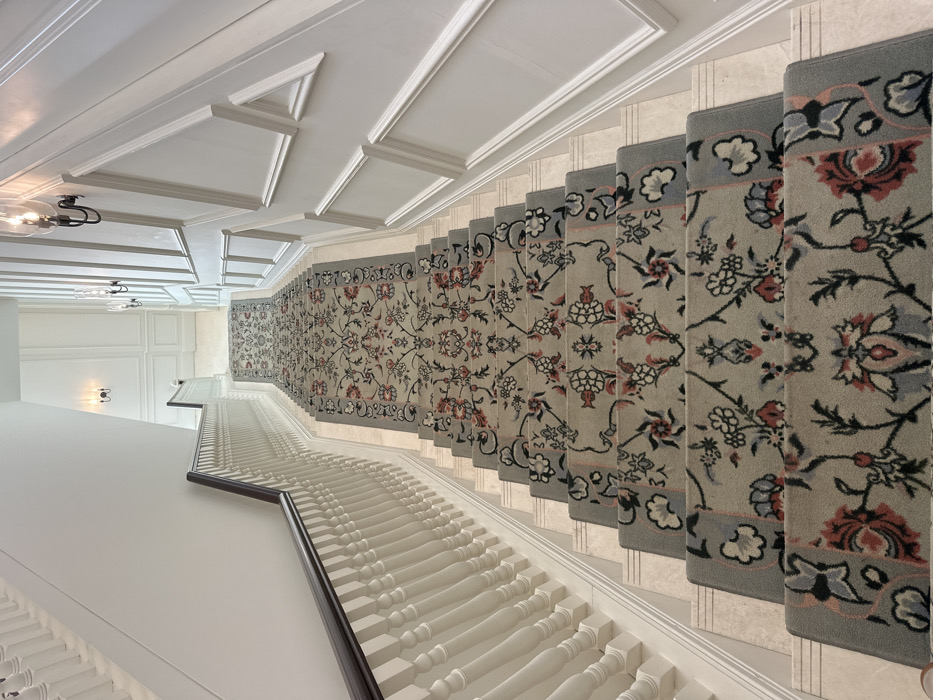 The image displays an unoccupied interior staircase ascending directly upwards, situated in Doha, Qatar. The staircase features light-toned stone treads and risers, centrally covered by a carpet runner. This runner exhibits an intricate pattern of grey-blue, red, pink, black, and light blue floral and scroll motifs. On the left, a white balustrade with turned posts supports a dark wooden handrail, bordering a plain white wall. The wall to the right is finished with white, classically-styled paneling and molding, from which multiple dark-colored sconces with clear glass shades project, providing artificial illumination. No individuals, additional objects, or active interactions are present within the frame.