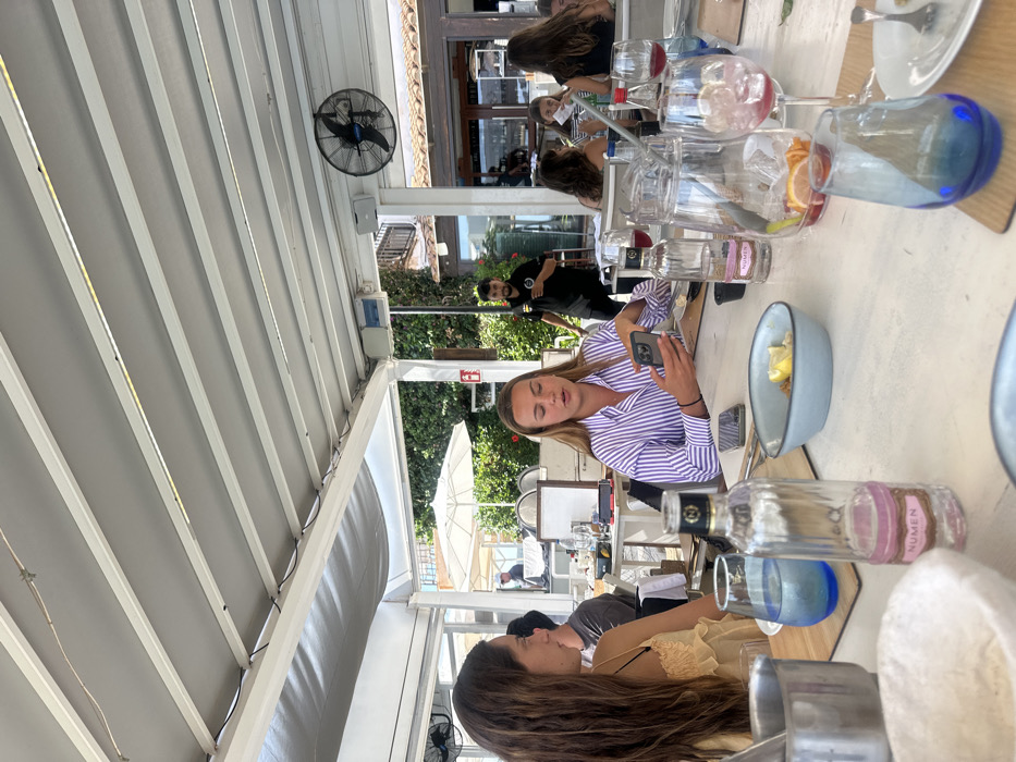 The image captures an outdoor dining scene at a restaurant in Sant Elm, Spain