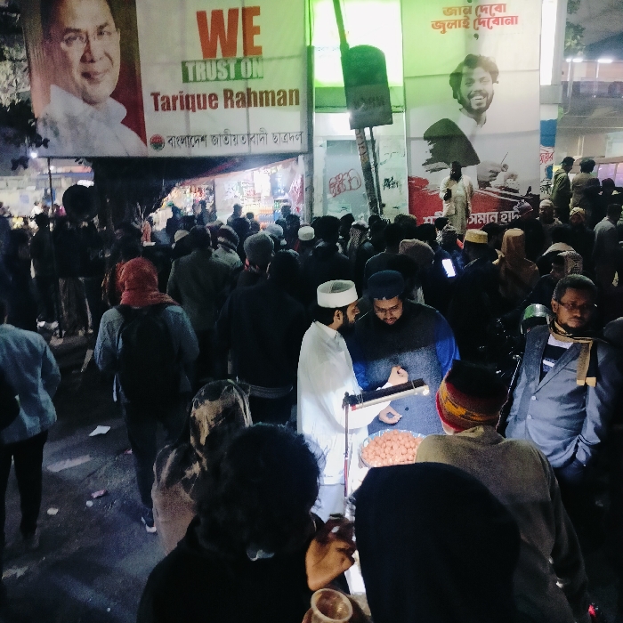 The image displays a densely crowded, artificially lit nighttime street scene in Dhaka, Bangladesh